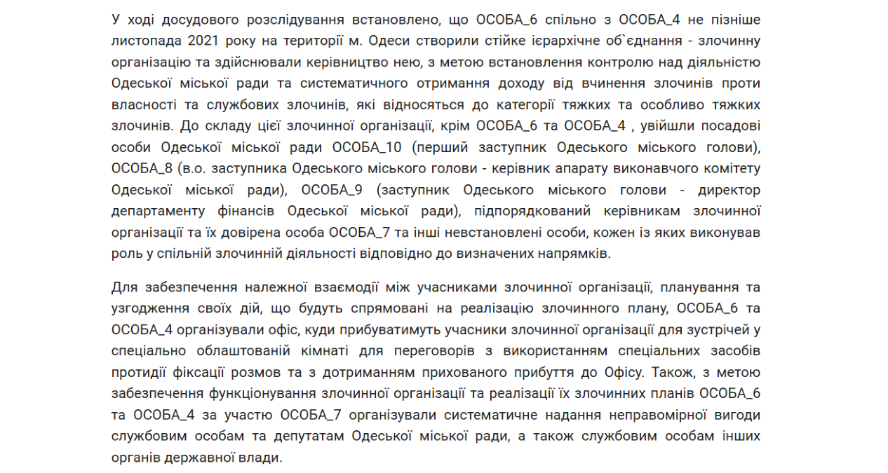 До цієї структури, за версією правоохоронців, могли бути залучені високопосадовці міської ради, а також інші особи, які виконували визначені ролі. Для координації дій організували спеціальне приміщення із засобами захисту від прослуховування та налагодили систему надання хабарів чиновникам.