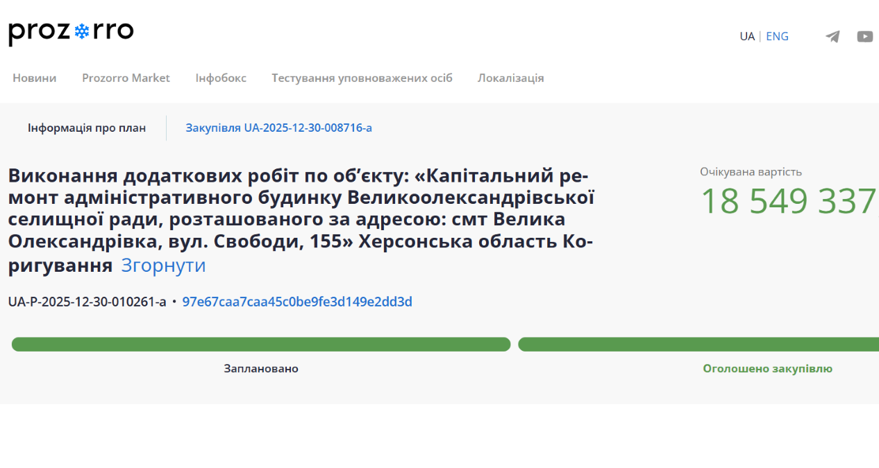 Тендер на реконструкцію адміністративного будинку Високопільської селищної ради стартував у серпні. Проєкт передбачав переобладнання будівлі під сучасну амбулаторію сімейної медицини з фінансуванням від ЄС у рамках програми Ukraine Facility.