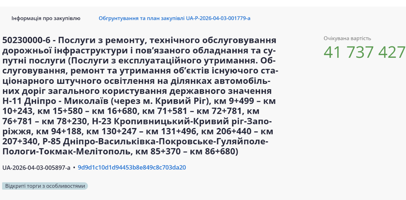 Замовником виступила Служба відновлення та розвитку інфраструктури у Дніпропетровській області. Очікувана вартість закупівлі становила 41,7 мільйона гривень.