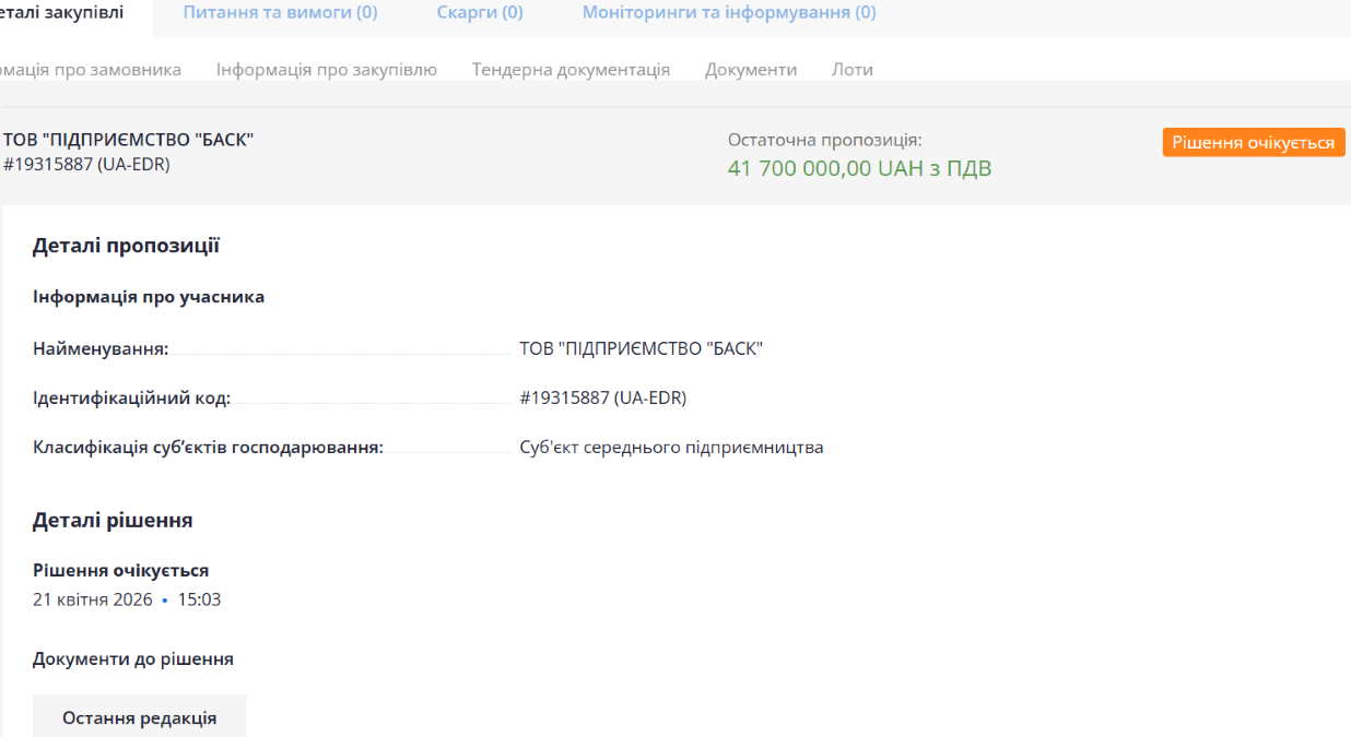 Найменшу цінову пропозицію — 41,7 мільйона гривень — подало ТОВ "Підприємство "БАСК", що зробило його лідером торгів. Наразі компанія очікує остаточного рішення замовника щодо укладення договору.