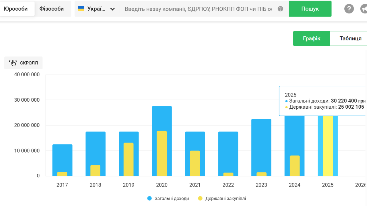 З 2017 року підприємство отримало понад 86 мільйонів гривень на державних тендерах, причому найбільші надходження зафіксовані у 2025 році — понад 25 мільйонів гривень. У 2022–2023 роках активність компанії в закупівлях була мінімальною.