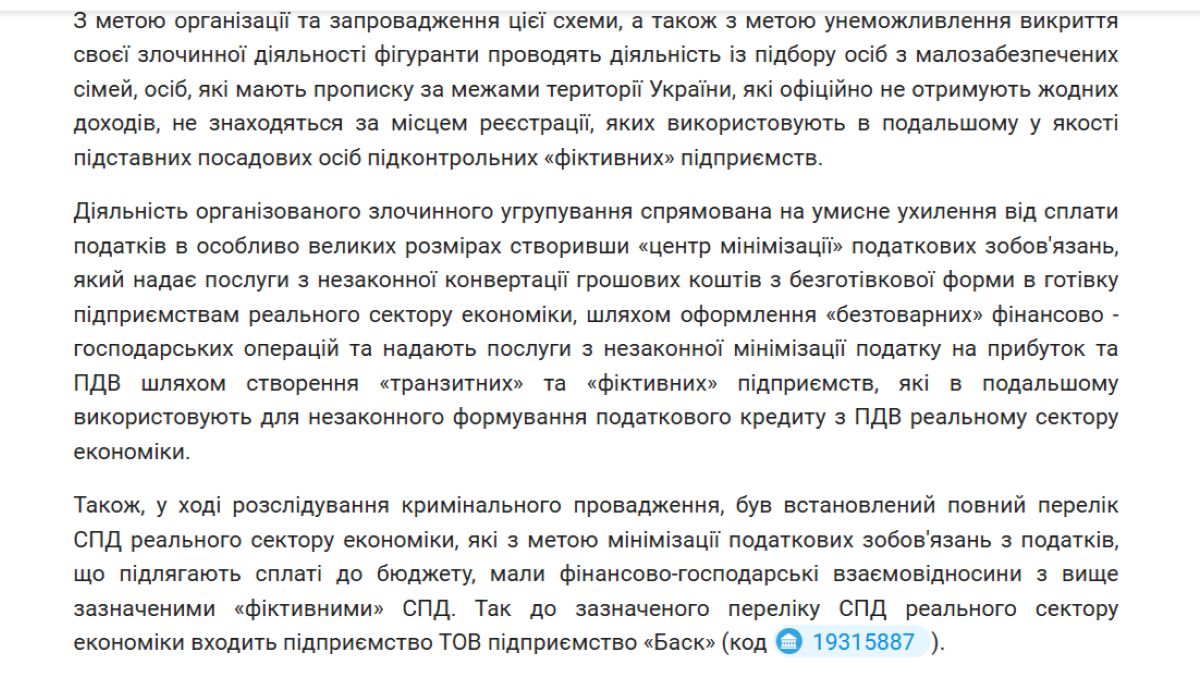 Серед компаній, які, за даними слідчих, могли користуватися такими схемами, згадувалося і ТОВ "Підприємство "Баск". У межах розслідування суд надавав дозвіл на проведення обшуків у низці пов’язаних підприємств.