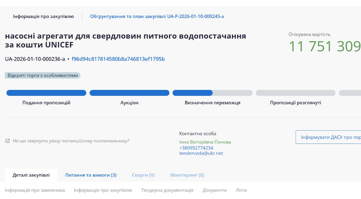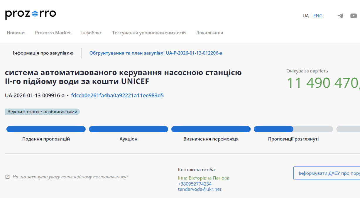Окремо комунальне підприємство оголосило ще одну закупівлю — на систему автоматизованого керування насосною станцією другого підйому води, також за кошти UNICEF. Очікувана вартість становить 11,4 мільйона гривень, а поставку обладнання мають здійснити до 20 травня 2026 року. Цього разу участь у тендері взяла лише одна компанія — ТОВ "Динамо-Континент", яку й визначили переможцем.