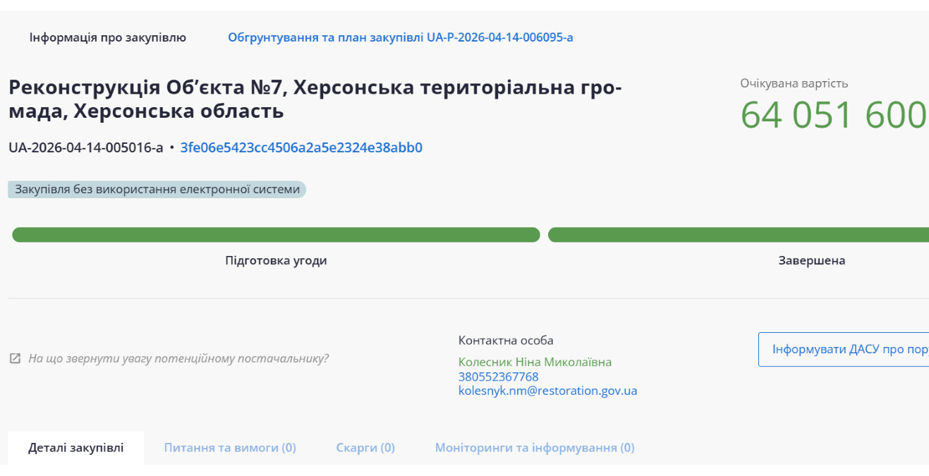 Найдорожчим виявився контракт на реконструкцію об’єктів №9 і №10 — його оцінили у 128,1 мільйона гривень. Ще два договори передбачають по 64,05 мільйона гривень кожен — для об’єктів №6 та №7.