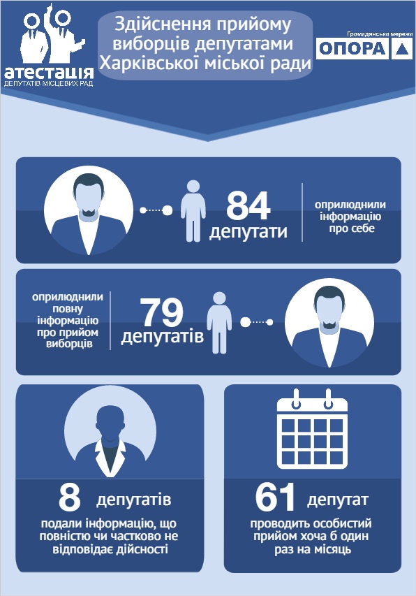 В рамках кампанії Атестація депутатів місцевих рад, яка охоплює вісім областей України, Харківське представництво Всеукраїнської громадської організації «Громадянська мережа «ОПОРА» проаналізувало оприлюднення депутатами Харківської міської ради (ХМР) інформації про прийом на сайті ради, а також перевірила здійснення прийому виборців депутатами.