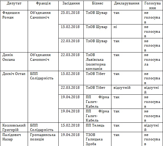 Найбільша кількість випадків реального або потенційного конфлікту інтересів припадає на двох депутатів Остапа Доскіча і Романа Федишина, які протягом перших чотирьох місяців поточного року потрапляли у таку ситуацію чотири і три рази відповідно.