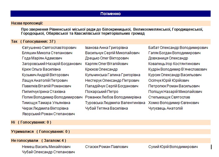 Також під час пленарного засідання депутати розглянули Звернення Рівненської міської ради до Білокриницької, Великоомелянської, Городищенської, Городоцької, Обарівської та Квасилівської територіальних громад щодо об’єднання з метою забезпечення ресурсів та перспектив спільного розвитку. Зокрема, документом окреслено ряд заходів, які декларує Рівнерада: