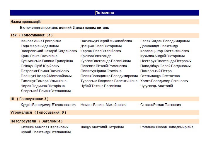 - Анна Іванова (фракція Всеукраїнське об’єднання «Свобода);