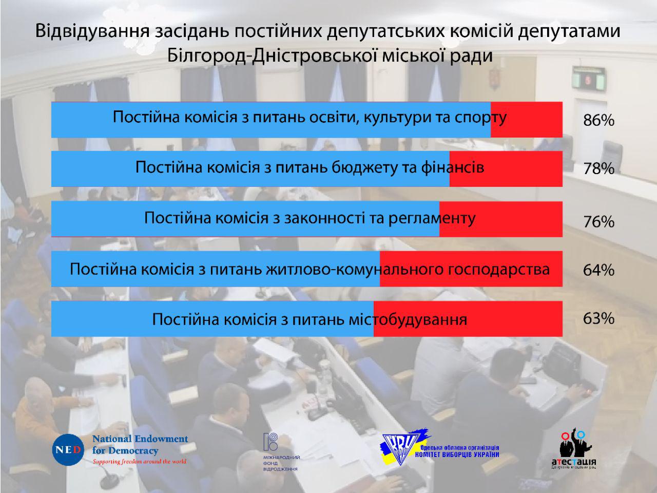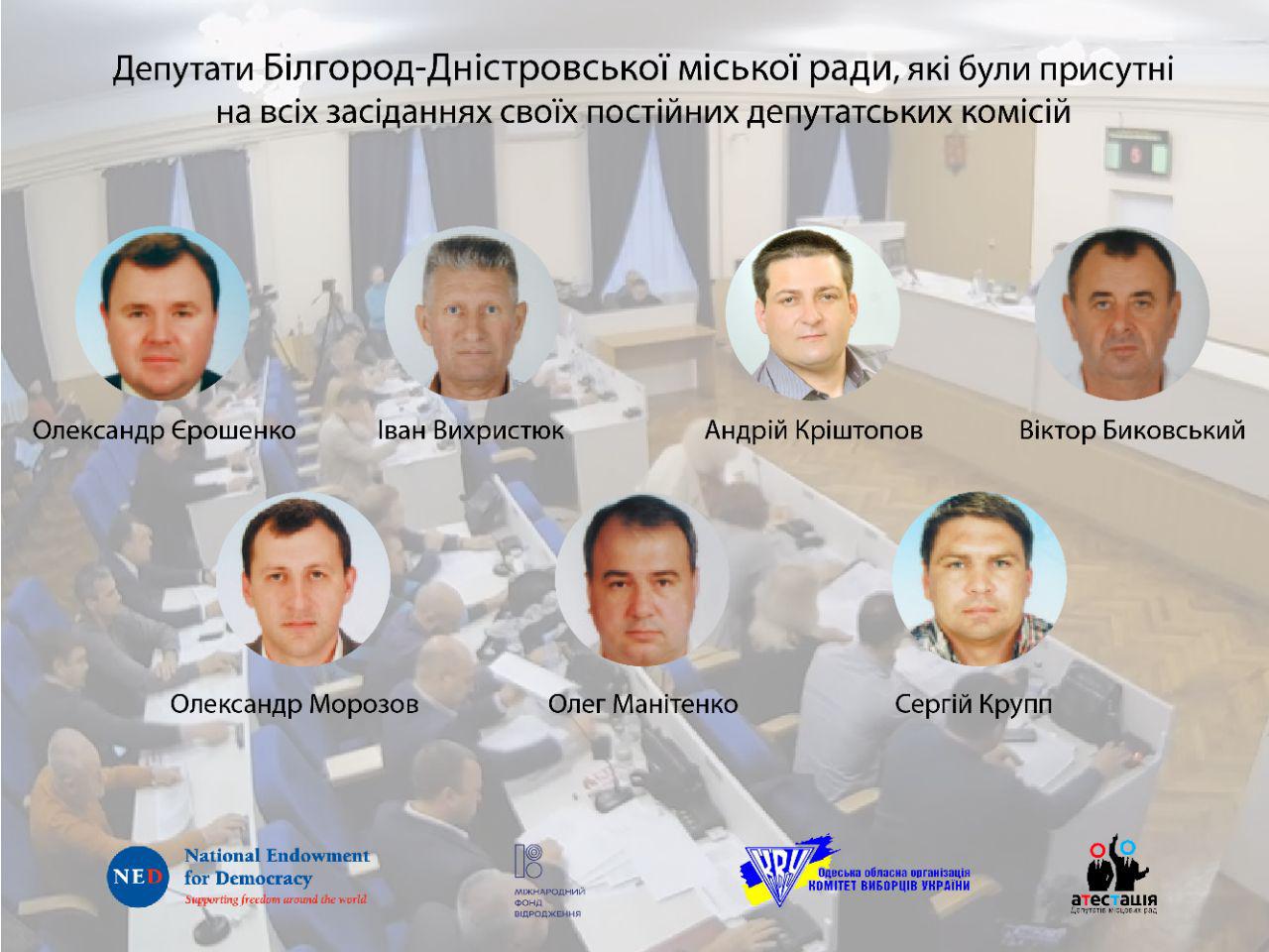 Від 78 до 50% засідань постійних депутатських комісій відвідали восьмеро депутатів Білгород-Дністровської міської ради: Леонід Кондратюк, В’ячеслав Римський ("БПП «Солідарність»), Юрій Чередниченко, Василь Садовський («Опозиційний блок»), Олег Крамар («Довіряй ділам»), Ігор Галат (ВО «Батьківщина»), Юлія Федорова, Ольга Ціпуленко (позафракційні).