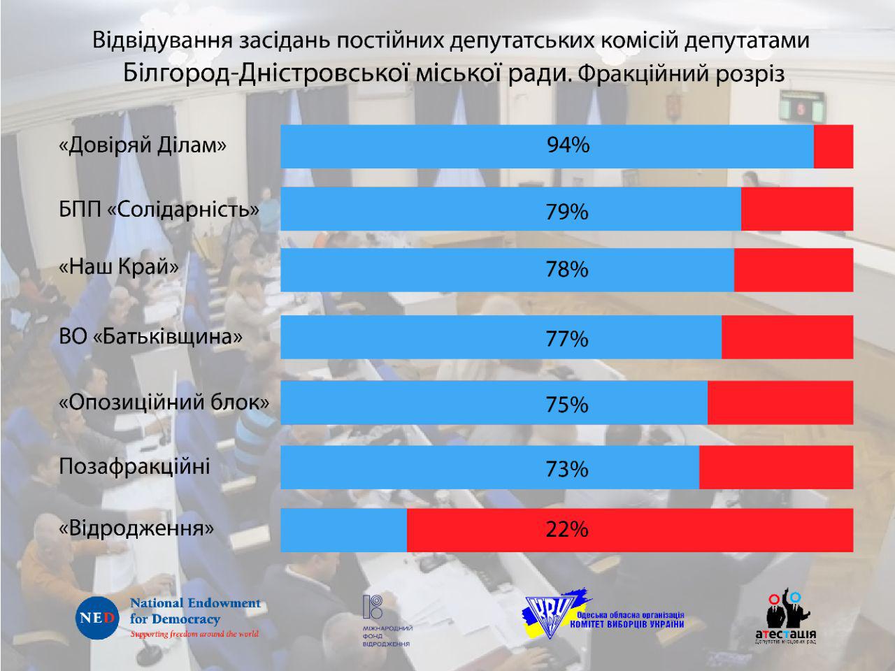 У фракційному розрізі найбільш активну участь у засіданнях свої постійних депутатських комісій демонструють представники від фракції «Довіряй Ділам» — 94%. Найменш активні у відвідуванні засідань своїх постійних депутатських комісій мають депутати від фракції «Відродження») — 22%.