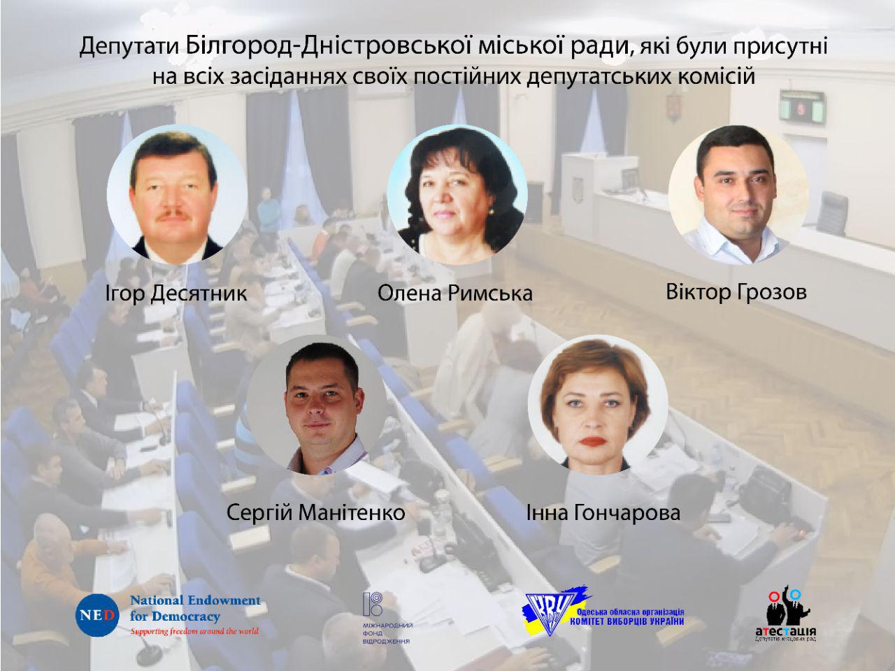 Аналіз участі депутатів Білгород-Дністровської міської ради у засіданнях постійних депутатських комісій, до складу яких вони входять, на основі протоколів постійних депутатських комісій в період з 1 листопада 2018 року по 31 жовтня 2019 року свідчить про те, що абсолютний показник участі мають п’ятеро депутатів Білгород-Дністровської міської ради. Так, до єдиної депутатки, яка відвідала всі засідання комісії минулого року - Інни Гончарової ("Опозиційний блок"), цього року приєдналися Ігор Десятник, Олена Римська ("БПП "Солідарність"), Віктор Грозов, Сергій Манітенко («Наш край»).
