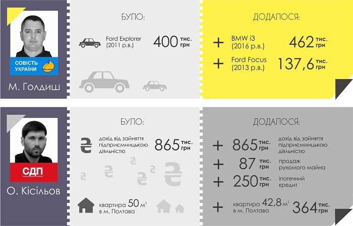 Ще троє депутатів упродовж року з моменту подання декларацій двічі вносили до них зміни. Максим Голдиш від "Совісті України" зазначав, що придбав у Сполучених Штатах Ford Focus (2013 р.в.) за 137 тис. 649 грн та електромобіль BMW i3 (2016 р.в.) за 462 тис. 134 грн.