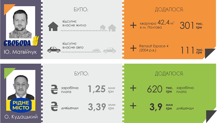 Обранець від "Рідного міста" Олександр Кудацький повідомив, що отримав 3 млн 974 тис. 54 грн дивідендів та 620 тис. 207 грн заробітної плати від ПАТ "Полтавський завод медичного скла". Згідно з YouControl, депутат є директором та володіє близько 10% акцій цього підприємства.