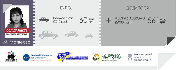 А от представниця фракції БПП "Солідарність" Майя Матвеєва сповістила, що придбала автівку Audi A6 Allroad (2008 р.в.) за 561 тис. 643 грн.