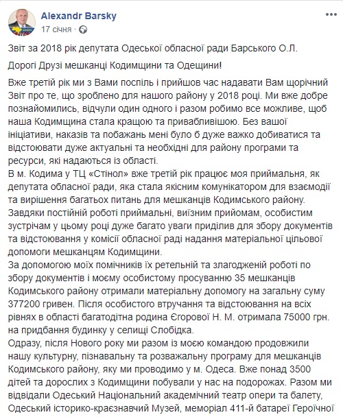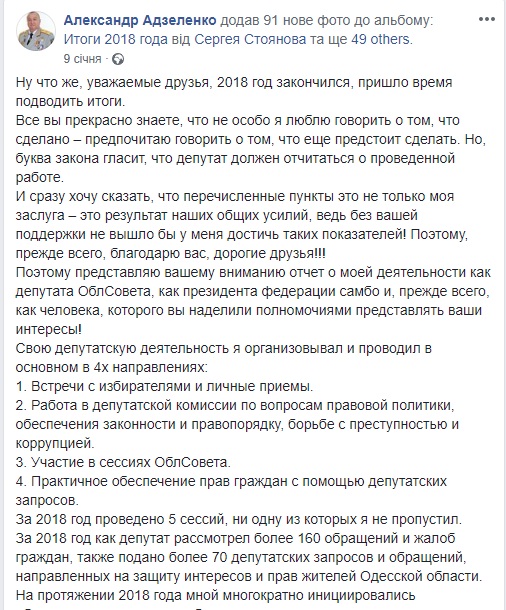 Саме на виконання цього положення Одеською обласною радою на 21 сесії ради було прийнято рішення «Про звіти депутатів Одеської обласної ради VІІ скликання за 2018 рік». Відповідно до цього рішення, депутатам Одеської обласної ради у термін до 25 березня 2019 року необхідно було проінформувати обласну раду про результати обговорення звітів про свою роботу, зауважень і пропозицій, висловлених виборцями на адресу ради та її органів, а також про доручення даних депутатові у зв'язку з його депутатською діяльністю. Крім того, депутати мали подати вищезазначену інформацію безпосередньо до апарату обласної ради.