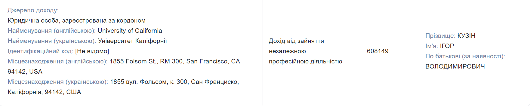 За минулий рік Ігор Кузін заробив 2 млн 137 тис. 172 грн. При цьому 1 млн 374 тис. 410 грн - це гонорари та інші виплати згідно з цивільно-правовим правочинами. А ось Університет Каліфорнії надав Кузіну можливість заробити понад 600 тисяч гривень.