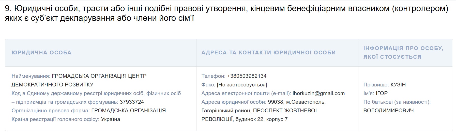 Водночас він, як бенефіціар, має відношення до "Громадської організації Центр демократичного розвитку" - до речі, її юридична адреса зареєстрована в окупованому Севастополі. Це зазначено в деклараціях за 2020 і 2021 роки.