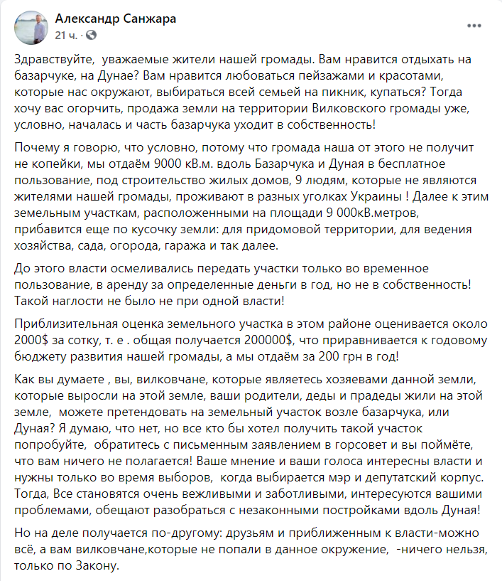 «Ми віддаємо 9000 кв. м вздовж Базарчука і Дунаю в безкоштовне користування, під будівництво житлових будинків, людям, які не є жителями нашої громади, проживають в різних куточках України!.. Приблизна оцінка земельної ділянки в цьому районі оцінюється близько $2000 за сотку, тобто загальна вартість виходить $200 000, що прирівнюється до річного бюджету розвитку нашої громади, а ми віддаємо за 200 грн на рік!» - написав він.
