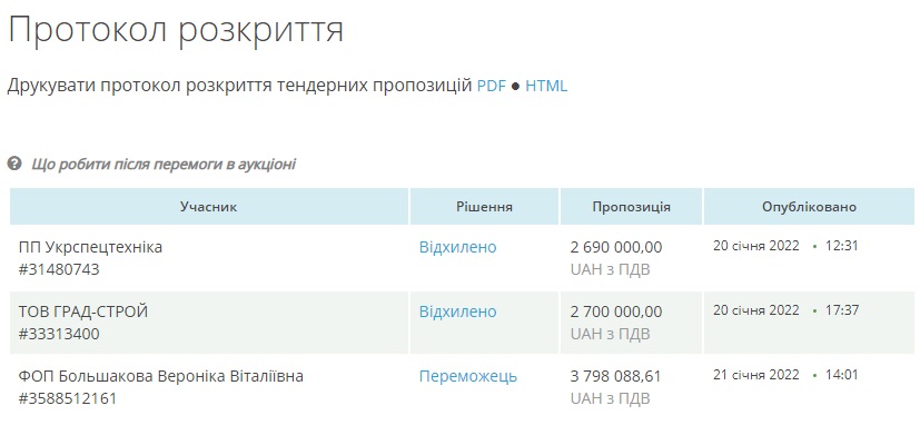Аукціон, про який йдеться в заяві прокуратури, відбувся 21 січня і в ньому окрім ФОП Вероніки Большакової брали участь приватне підприємство "Укрспецтехніка" та товариство з обмеженою відповідальністю "Град-Строй".