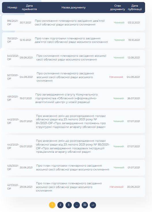 Серед тих, що є у доступі, 16 розпоряджень є чинними, 2 нечинних та ще 2 розпорядження про внесення змін (стосуються положень про структурні підрозділи апарату обласної ради).