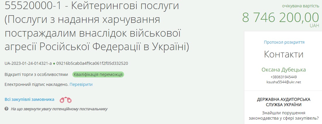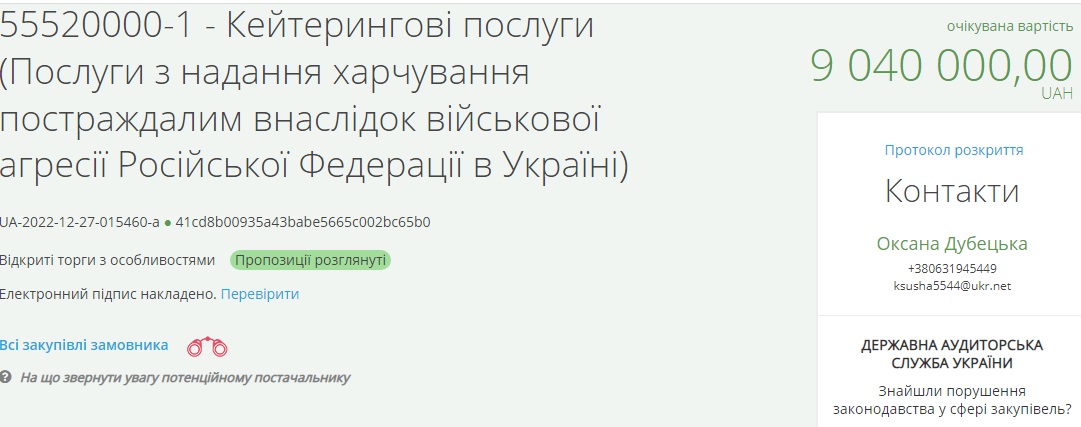 Минулого року на тендерах з організації харчування фірма отримала 165 мільйонів 900 тисяч гривень. А з початку 2022 року – майже 130 мільйонів гривень.