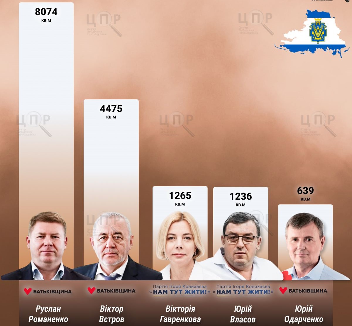 Депутатка Вікторія Гавренкова задекларувала телятник на 1265 квадратних метрів у Херсонському районі. Депутат від партії Ігоря Колихаєва “Нам тут жити!” Юрій Власов володіє нежитловими приміщеннями у Нікопольському районі Дніпровщини на 1236 квадратів. Його дружина бізнес-приміщень не має.
