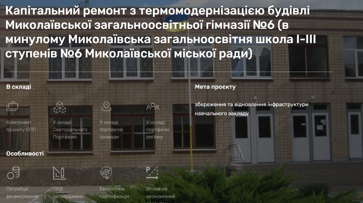 У проєкті представлено капітальний ремонт з термомодернізацією будівлі Миколаївської загальноосвітньої гімназії №6. Метою є збереження та відновлення інфраструктури навчального закладу.
