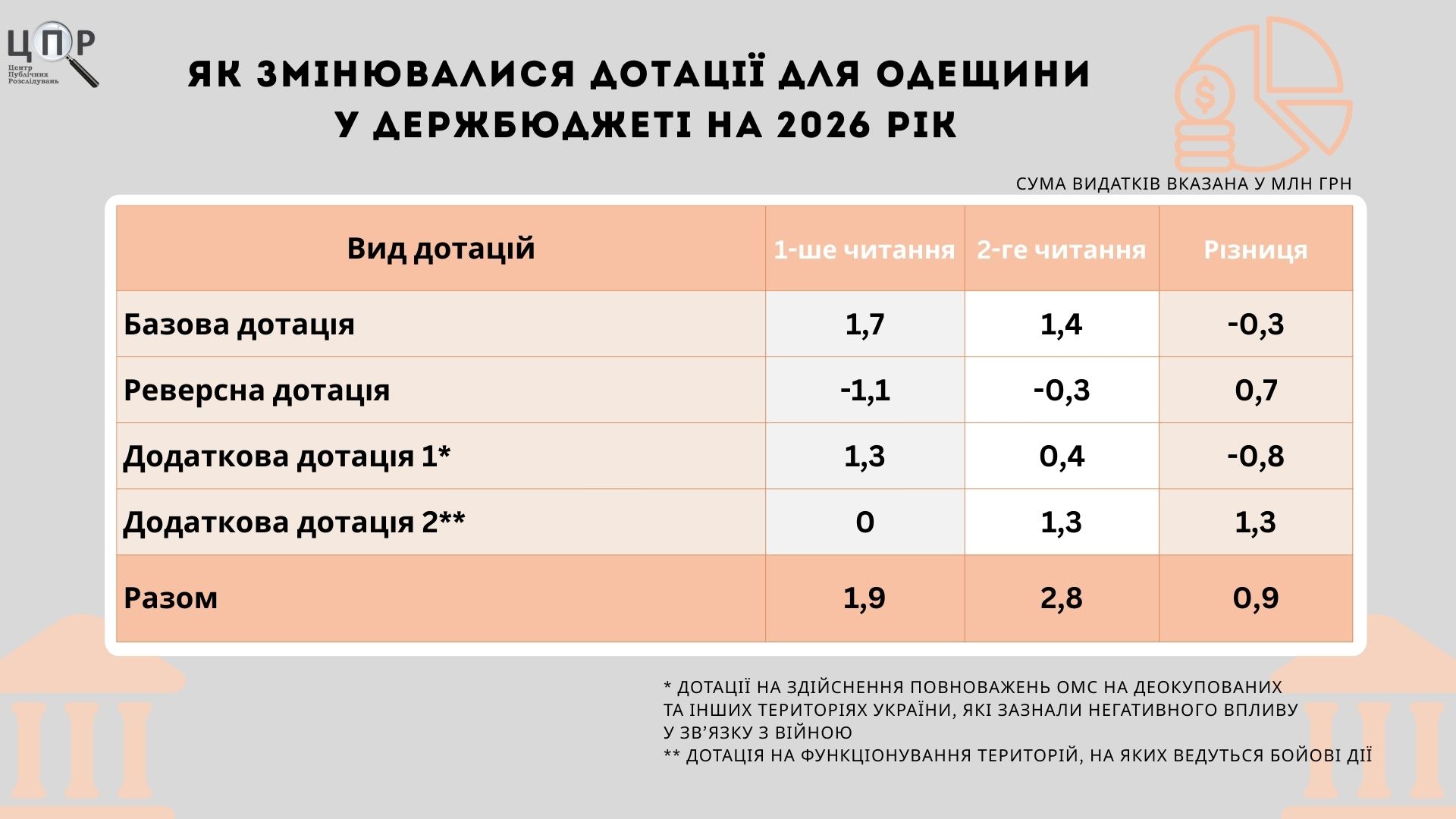 Спочатку Одеській області планували надати 1,9 мільярда, а потім вирішили виділити 2,8 мільярда гривень. У результаті загальна сума дотацій для Одеської області між першим і другим читанням зросла на 928,3 мільйона гривень.