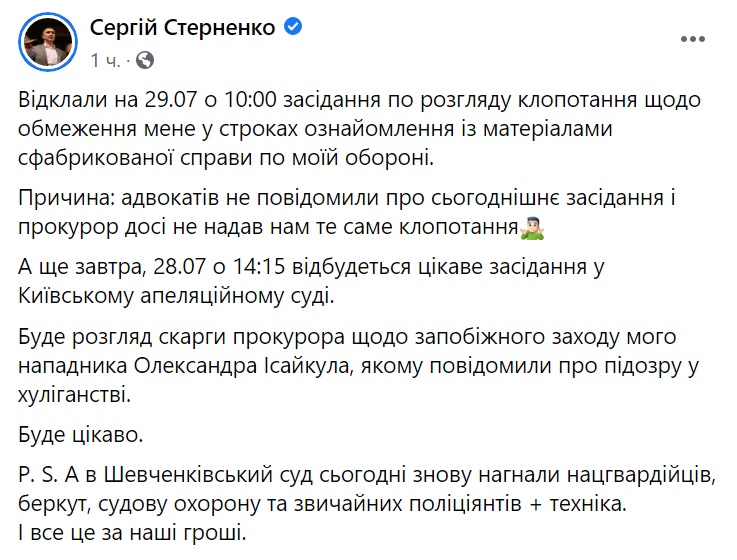 «Відклали на 29 липня о 10:00 засідання по розгляду клопотання щодо обмеження мене у строках ознайомлення із матеріалами сфабрикованої справи по моїй обороні. Причина: адвокатів не повідомили про сьогоднішнє засідання, і прокурор досі не надав нам те саме клопотання» - написав активіст.