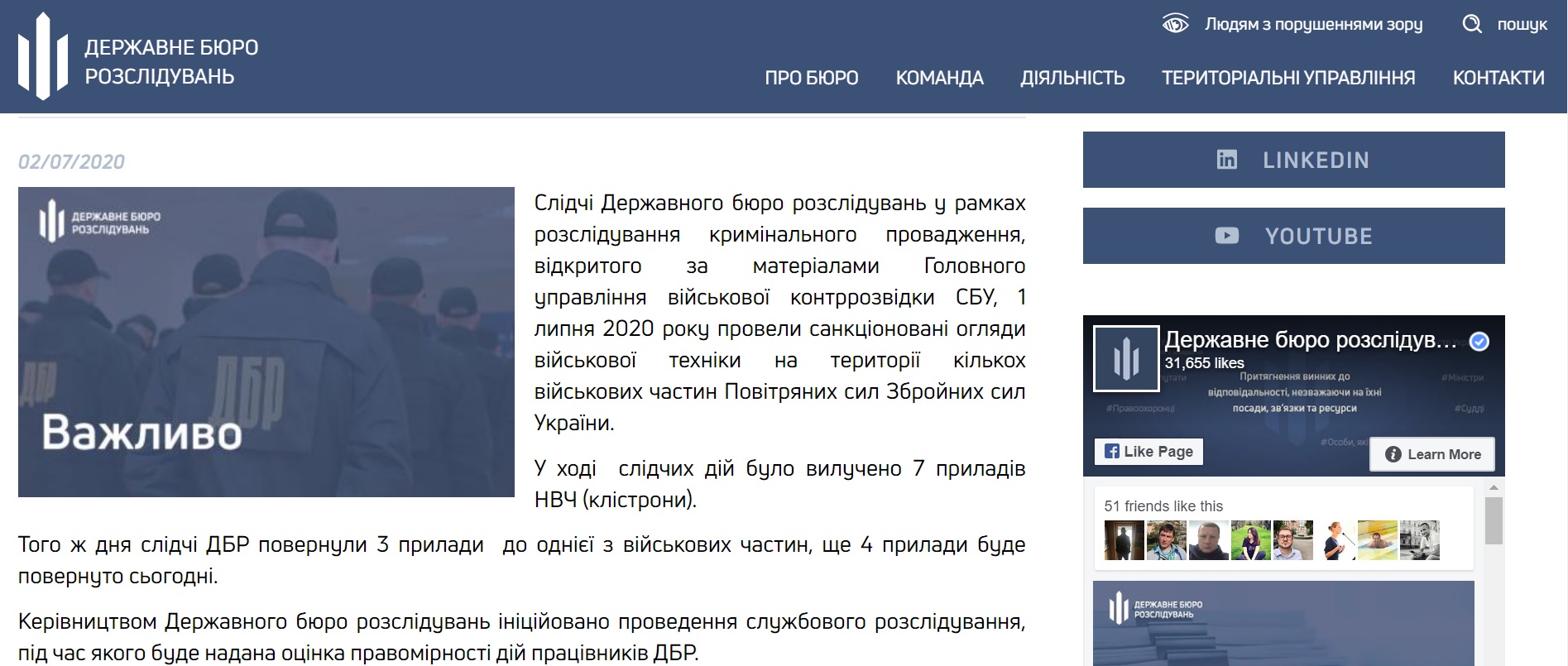 Також, за матеріалами Управління Внутрішнього контролю, Головним слідчим управлінням ДБР відкрито кримінальне провадження за фактом перевищення влади або службових повноважень працівниками ДБР та СБУ під час вилучення військового майна (ч. 3 ст. 365 Кримінального кодексу України).