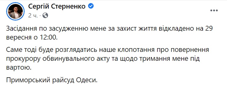 25 августа активист Сергей Стерненко получил отказ Верховного суда Украины в удовлетворении ходатайства об изменении подсудности.