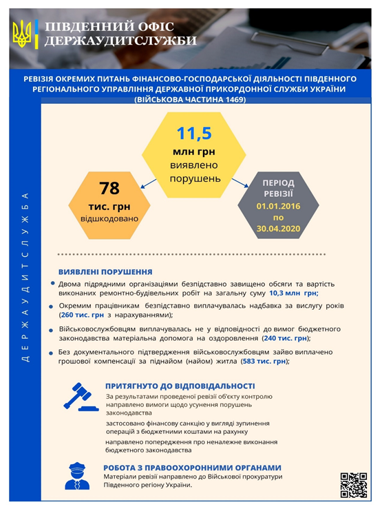 Під час ревізії окремих питань фінансово-господарської діяльності Південного регіонального управління Державної прикордонної служби України (військова частина 1469) працівники Південного офісу Держаудитслужби виявили порушень, що призвели до втрат фінансових та матеріальних ресурсів, на загальну суму 11,5 млн грн.
