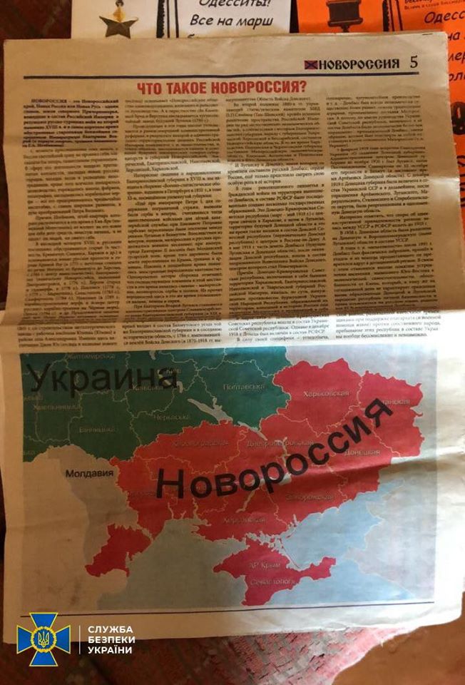 Під час обшуків у активістів проросійського руху правоохоронці виявили значну кількість друкованої продукції, яка містить відверту антиукраїнську пропаганду сепаратистського характеру. Зокрема, вилучені листівки з поділом України на фейкову «республіку новоросія» і «бандерівську Україну», наліпки з написами «Одесса русский город» та «Одесса – Новороссия», символіку із пропагандою тоталітарного режиму, друковані видання, так звану газету «новоросія» та іншу заборонену законодавством продукцію.
