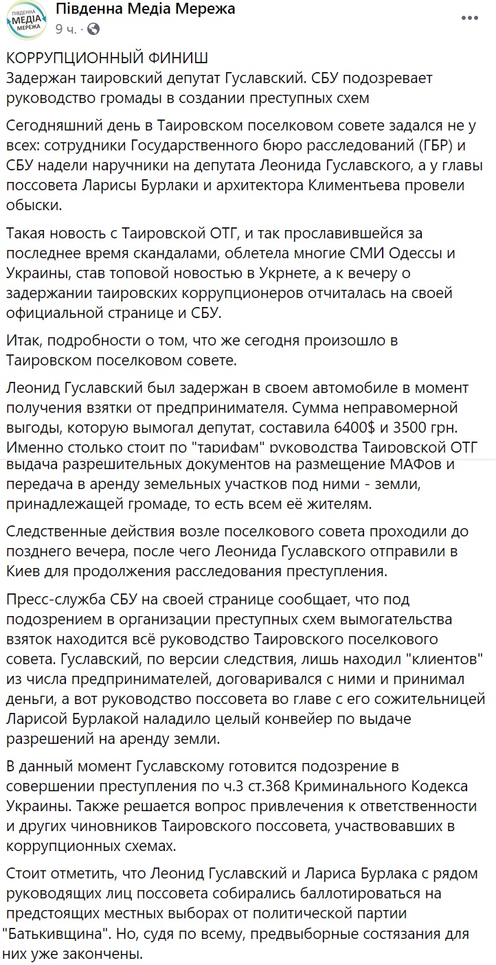 За даними «Південної Медіа Мережі» затримали депутата Леоніда Гуславського.