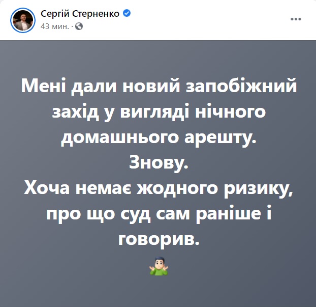 Напередодні 17 грудня Сергій Стерненко писав, що його домашній арешт закінчився майже три тижні тому і що прокурори хочуть «закрити його в СІЗО».