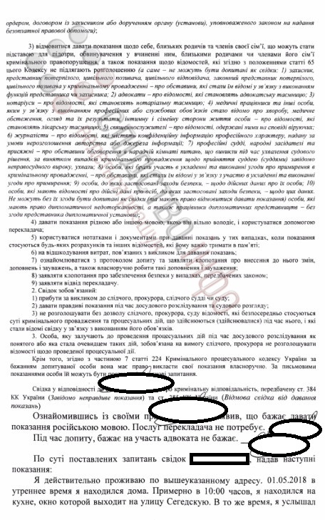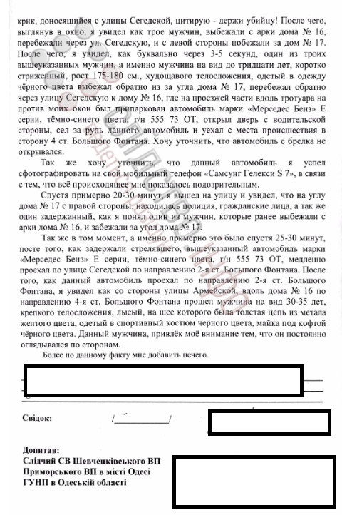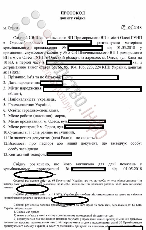 Протокол допиту свідка у провадженні щодо нападу на одеського активіста/Документ: Слідство.Інфо