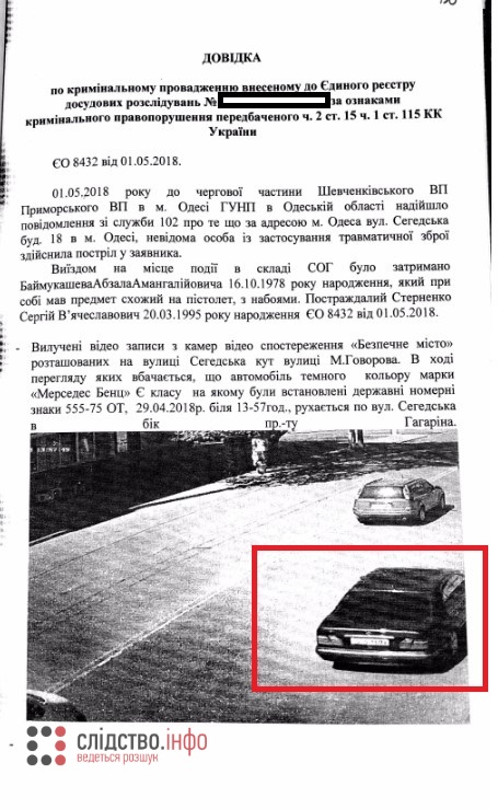 "На проїжджій частині вздовж тротуару навпроти моїх вікон був припаркований автомобіль марки Mercedes-Benz Е серії, темно синього кольору номерний знак 555-73 ОТ". За словами свідка, чоловік сів за кермо і поїхав. Ситуація насторожила моряка, відтак — він вирішив сфотографувати машину. Та незабаром він помітив її вдруге. Авто проїжджало поруч з місцем злочину вже в момент затримання стрілка, коли приїхала поліція. З його слів, водій зупинився і ходив неподалік: "Цей чоловік звернув мою увагу на себе тим, що постійно озирався навкруги".