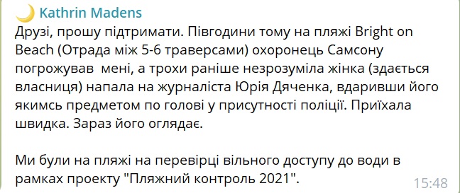 17:37. Юрій Дяченко підтвердив ізбірКому, що конфлікт стався через повторний візит активістів на пляж, під час якого були зафіксовані порушення. За його словами, адміністрація пляжу, окрім відсутності документів, не забажала звільнити 30% території для вільного доступу. Під час огляду 8 серпня невідомі громадяни намагалися заважати активістам, які врешті-решт викликали на місце поліцію. І згодом Юрій, який знімав на відео конфлікт Катерини Гуцол і охоронця, отримав удар металевим предметом по голові. Він стверджує, що його завдала та сама жінка, яка відмовлялася назвати себе, але поводилася як представниця адміністрації. Дяченко підтвердив, що йому надали медичну допомогу. І журналіст, і зазначена невідома громадянка дали свідчення поліції. На його думку, дії вищезгаданої жінки і охоронців "Самсона" є перешкоджанням журналістській діяльності.