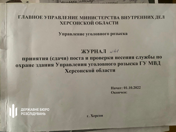 "Виявлено "журнал принятия (сдачи) поста и проверки несения службы по охране здания Управления уголовного розыска ГУ МВД Херсонской области". Окремо знайдено повні списки з адресами, телефонами, званнями, позивними колаборантів-поліціантів", – повідомили у ДБР.