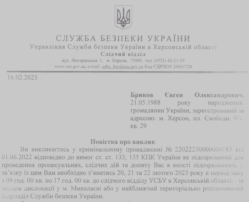 Повідомлення про підозру та повістки про виклик Брикова опубліковані на сайті Офісу генерального прокурора.