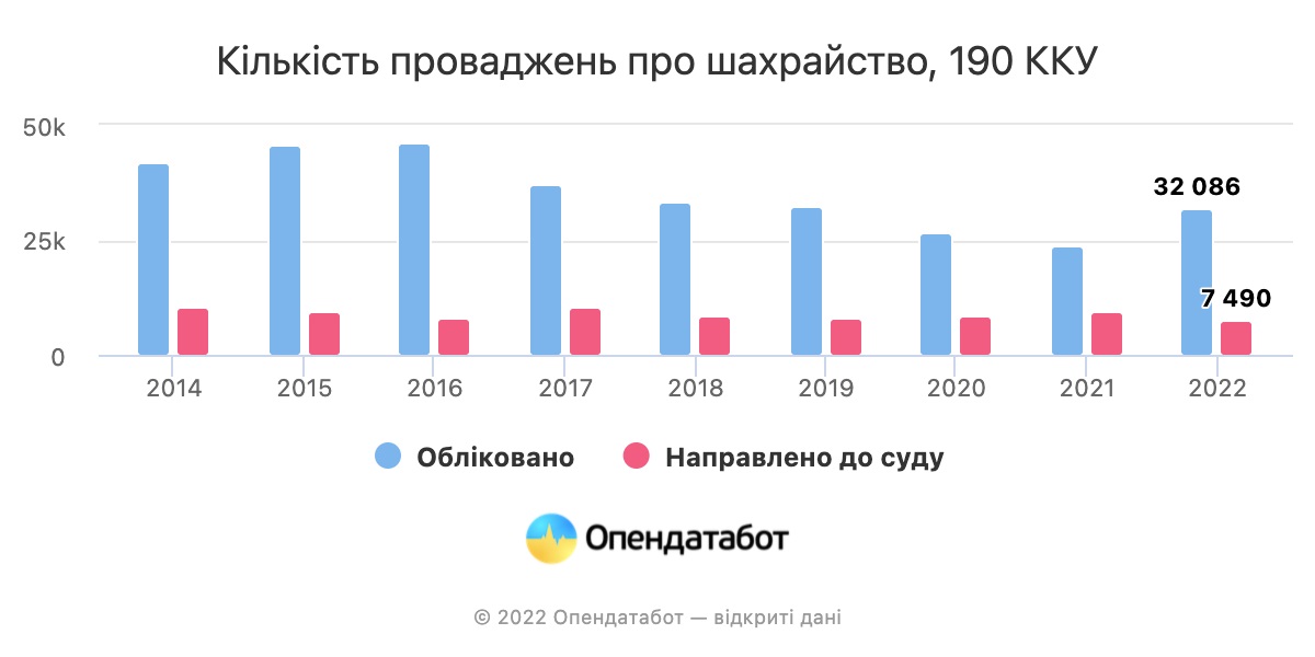 У рік повномасштабного вторгнення кількість облікованих проваджень за статтею 190 Кримінального кодекса України ("Шахрайство") зросла на 34%. Натомість частка справ, переданих на розгляд до суду, скоротилася вдвічі — з 34% до 18%.