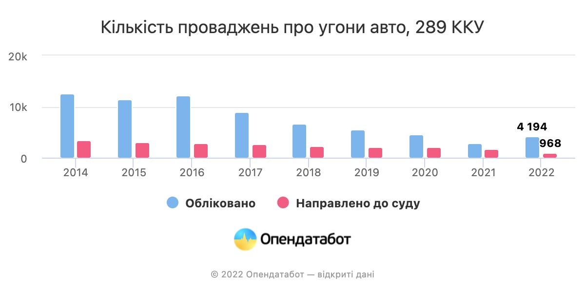 Майже вдвічі за рік зросла кількість облікованих проваджень про угони авто — з 2,8 тисяч до 4,1 тисячі справ. Варто зазначити, що цей показник стрімко виріс лише у порівнянні з "ковідним" 2021 роком. Натомість у попередніх роках кількість облікованих проваджень про угони авто була приблизно такою ж або навіть більшою.