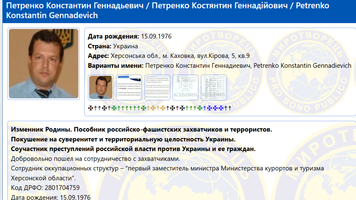 За інформацією ресурсу, Петренко добровільно пішов на співпрацю з окупантами та працював у структурах незаконної влади як "перший заступник міністра Міністерства курортів і туризму Херсонської області". Також зазначено, що до початку співпраці з окупаційною адміністрацією він обіймав посаду прокурора окружної прокуратури Херсонської області.