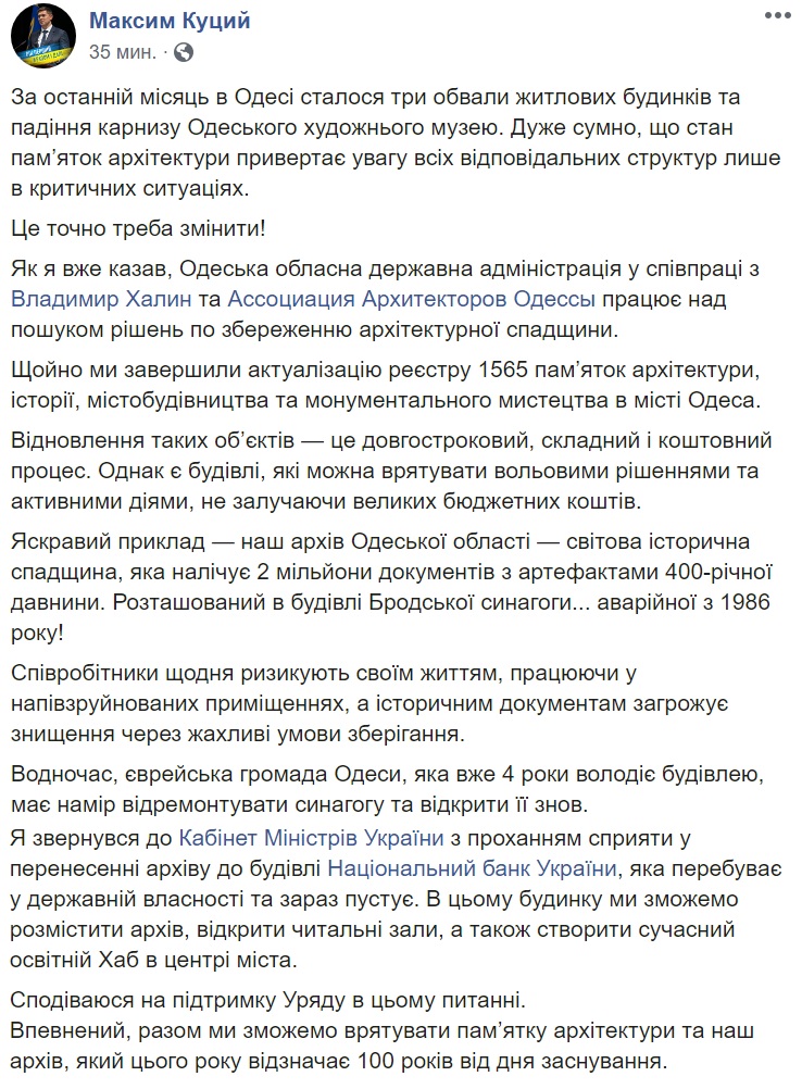"Надеюсь на поддержку правительства в этом вопросе. Уверен, вместе мы сможем спасти памятник архитектуры и наш архив, который в этом году отмечает 100 лет со дня основания», - написал глава ОГА.
