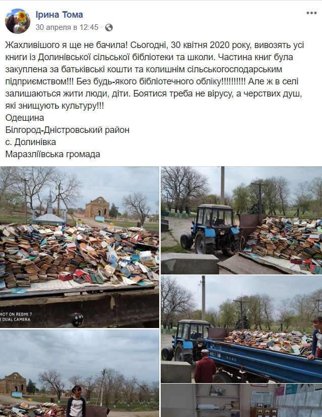 «Жахливішого я ще не бачила! Сьогодні, 30 квітня 2020 року, вивозять усі книги із Долинівської сільської бібліотеки та школи. Частина книг була закуплена за батьківські кошти та колишнім сільськогосподарським підприємством!!! Без будь-якого бібліотечного обліку!!! Але ж в селі залишаються жити люди, діти. Боятися треба не вірусу, а черствих душ, які знищують культуру!!! Одещина Білгород-Дністровський район с. Долинівка Маразліївська громада», - йшлося у повідомленні.