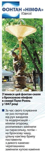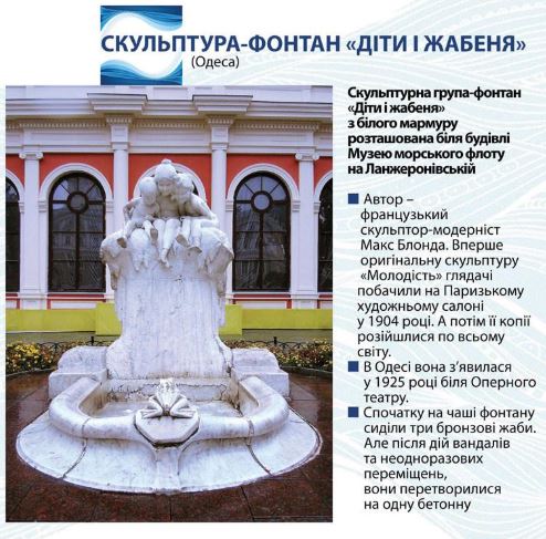 Серед одеських споруд до списку увійшли фонтан Міського саду, "Німфа" у Пале-Роялі та "Діти і жабеня".