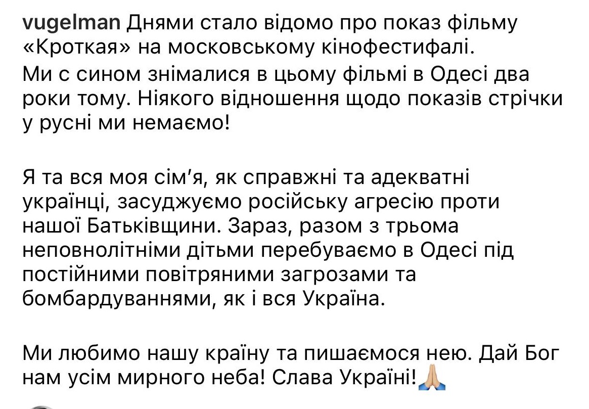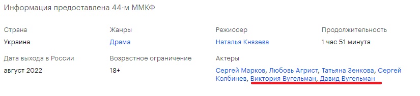 12:01 Дружина віцемера Одеси Вікторія Вугельман визнала, що брала участь у зйомці фільму проте наголосила, що вони із сином працювали у картині два роки тому, тож ніякого відношення до демонстрації стрічки на фестивалі в москві не мають.