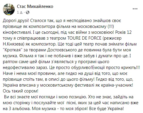 Однак, якщо у студії наполягають, що виступають за збереження "на Україні Великої класичної культури" та зазначають, що фільм подавали на кілька фестивалів ще минулого року, тож московський лише один з них, то композитор, натомість, обурився та заявив, що соромиться участі в створені картини. Стас Михайленко зазначив, що кінострічку почали знімати ще 12 років тому й саме тоді він співпрацював із Tour de Force.