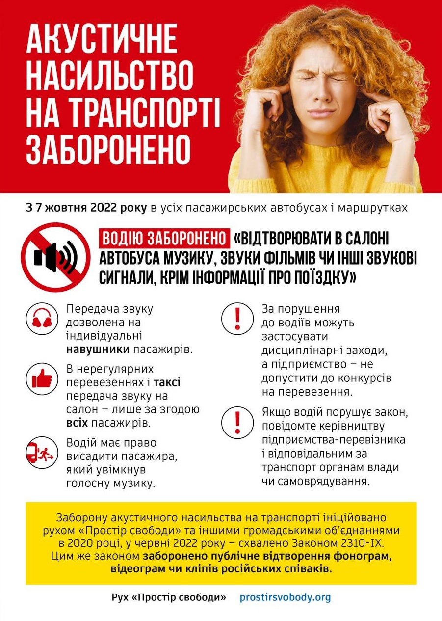 Окрім музики водіям заборонено вмикати звуки фільмів та будь-які сигнали, окрім передбачених для роботи, наприклад, оголошення зупинок.