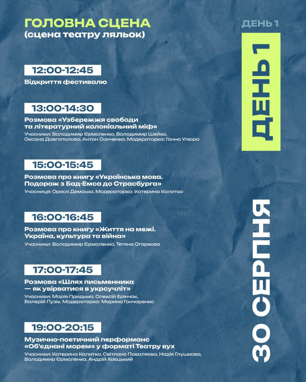 Програму фестивалю складатимуть понад 35 подій: літературні та музичні виступи, воркшопи з написання есеїв та поезії, презентації книг, ярмарок та майстер-класи. Однією з ключових подій стане музично-поетичний перформанс "Об'єднані морем", присвячений військовим морякам, які зникли безвісти з весни 2022 року. Глядачі зможуть спробувати формат театру Вух, коли виступи сприймаються на слух без зорового контакту.